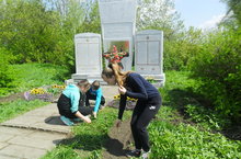 Благоустройство памятника. 06.05.2016 Сегодня учащиеся школы благоустраивали памятник павшим в ВО войне: занимались прополкой, выравниванием грядок, посадкой многолетних цветов.