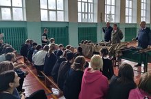 Осянин В. А. ознакомил ребят с историей обмундирования солдат времён ВО войны: гимнастерки, головные уборы ( буденовнка, шапка- ушанка, пилота, фуражка) , затем ребята имели возможность прикоснуться у реликвиям и даже примерить