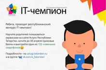Ребята, проходит республиканский конкурс IT-чемпион!Научите родителей пользоваться сервисами на сайте Услуги Республики Татарстан, копите до 30 апреля призовые баллы и выиграйте один из 135 новенких смартфонов.Подробности – на uslugi.tatarstan.ruИ в группе vk.com/e_tatarstan -