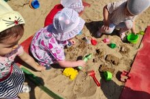 Во время прогулки малыши первой группы раннего возраста «Радуга» с удовольствием играют с песком.Дети с интересом знакомятся со свойствами сухого и мокрого песка,оставляют отпечатки разных предметов на влажном песке, любят рисовать на песке.