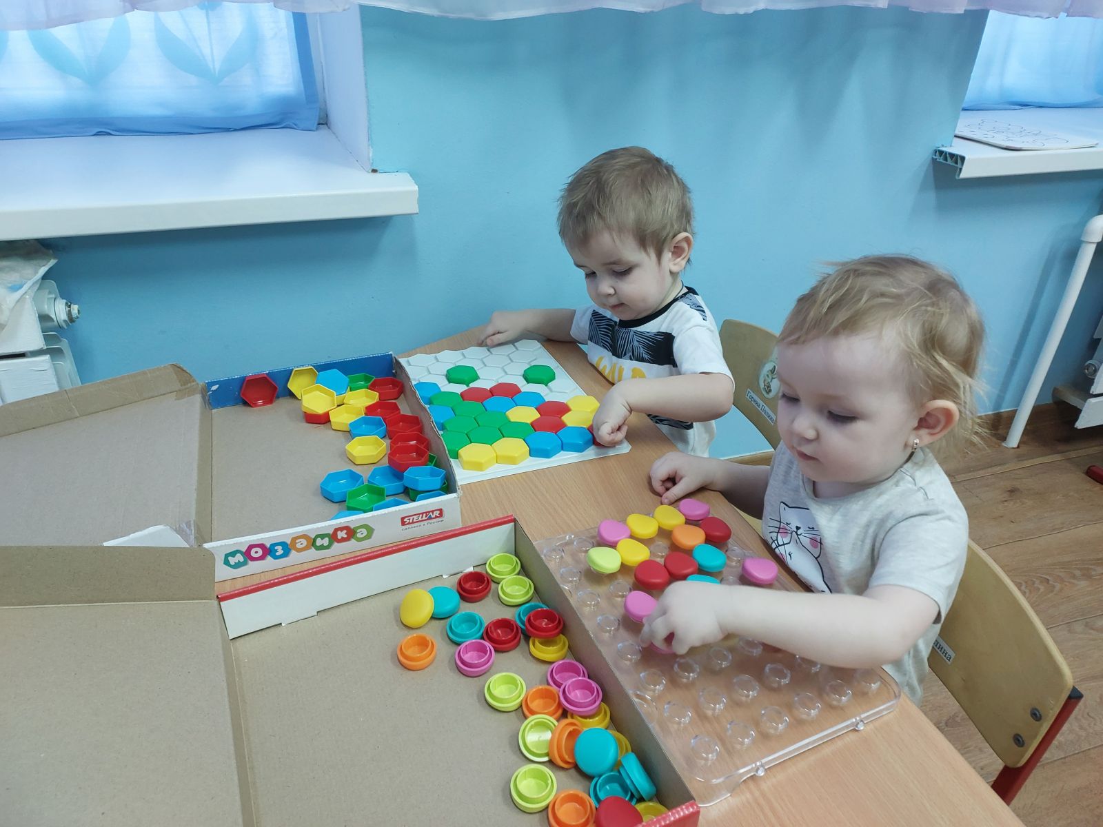 Воспитанники первой группы раннего возраста «Звездочки» очень любят игры с мозаикой. Игра с мозаикой – увлекательное занятие для детей. Мозаика – одна из тех полезных настольных игр, которая способствует развитию мелкой моторики рук, что положительно сказывается и на речевом развитии детей. Данная игра так же развивает глазомер, пространственное мышление, фантазию и упорство, воспитывает усидчивость и аккуратность.