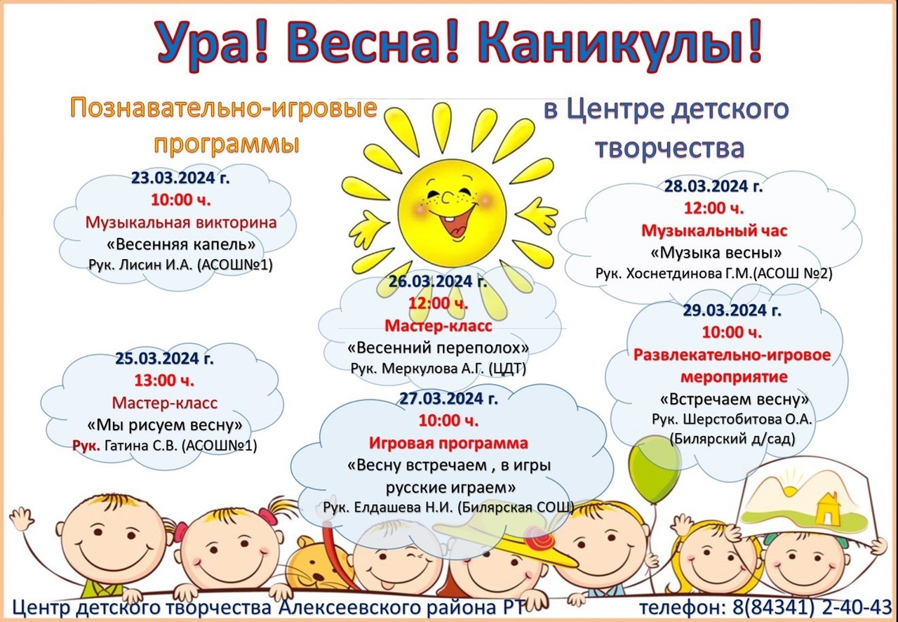 Вот и наступили весенние каникулы, прекрасное время для отдыха, радости.28 марта 2024 года на базе Алексеевской СОШ № 2 педагогами дополнительного образования были организованы мастер-классы для детей пришкольного лагеря.Дети сами выбрали мастер-класс по интересам и творческая работа началась.Ребята с педагогом Гатиной Светланой Вячеславовной выполнили из ватных дисков увлекательных животных, выполняя свое изделие, дети погрузились в творческую атмосферу, создавая своими руками яркие шедевры. Меркулова Алия Гарафутдиновна с ребятами изготовили мини-панно «Птичий переполох».Лисин Игорь Алексеевич провел игровую программу "Угадай мелодию!". Ребята с удовольствием угадывали знакомые мелодии из кино, мультфильмов и просто детские песни.Хоснетдиновой Гузель Минхадыевной была проведена конкурсно-игровая программа "Музыка весны", которая была посвящена самому живительному времени года - весне. На веселое мероприятие собрались ребята, чтобы отдохнуть и повеселиться. Вспомнили приметы весны, пословицы, поговорки, стихи, песни об этом времени года.Педагоги Центра детского творчества разнообразили досуг детей в пришкольном лагере. С заданием все справились и получили море позитива и положительной энергии от мастер-классов. -