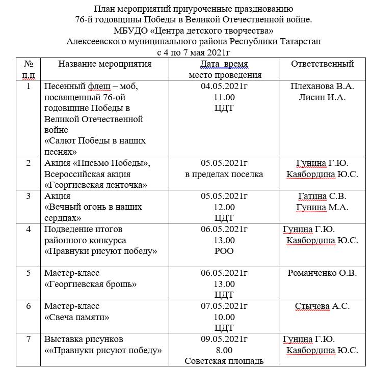ВНИМАНИЕ!!! ПЛАН МЕРОПРИЯТИЙ ко ДНЮ ПОБЕДЫ 29.04.2021