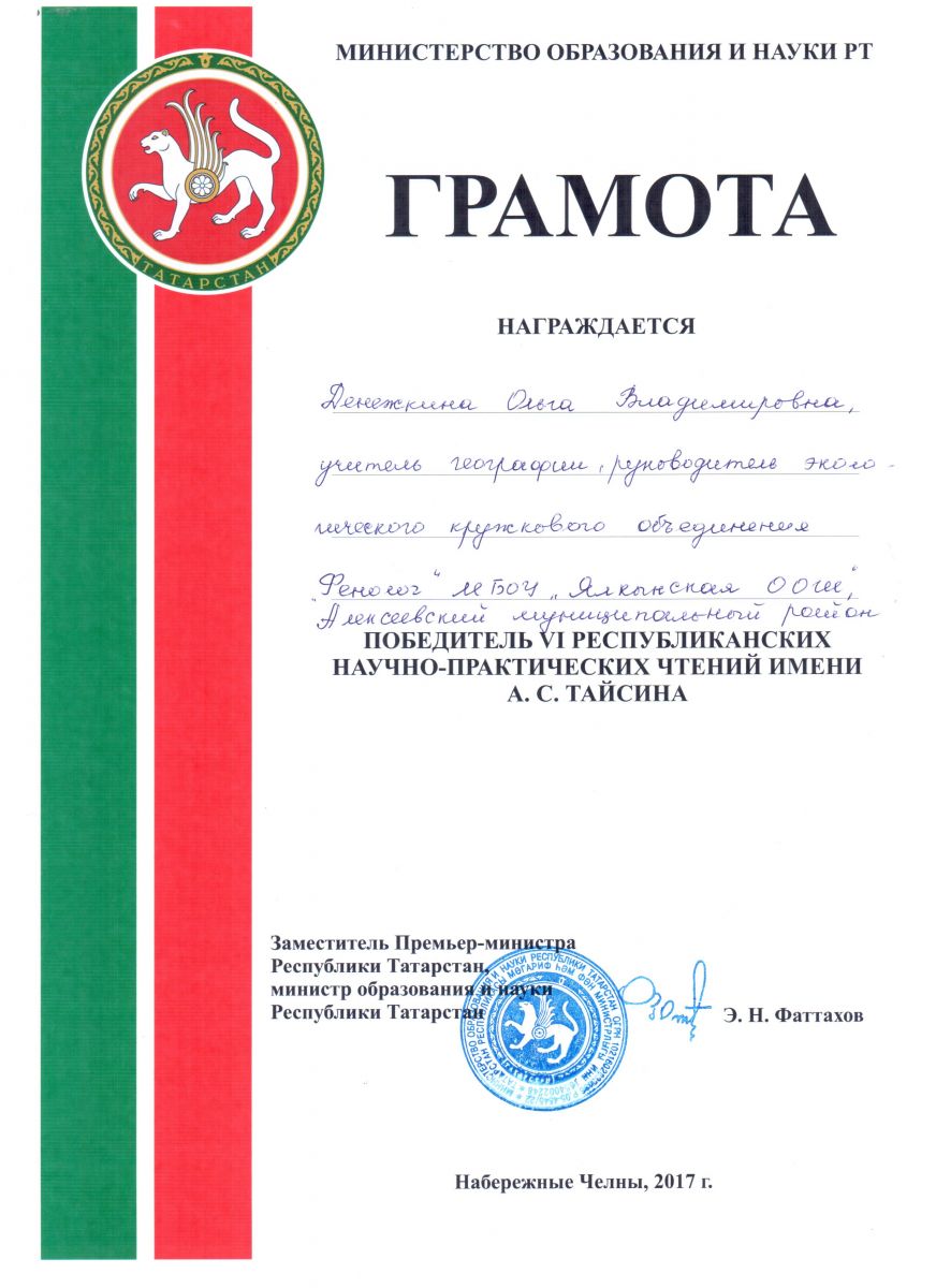 VIеспубликанские научно-практические чтения имени А.С.Тайсина, Шайхутдинова Ф.Г. , Грамота победителя , март 2017 г.