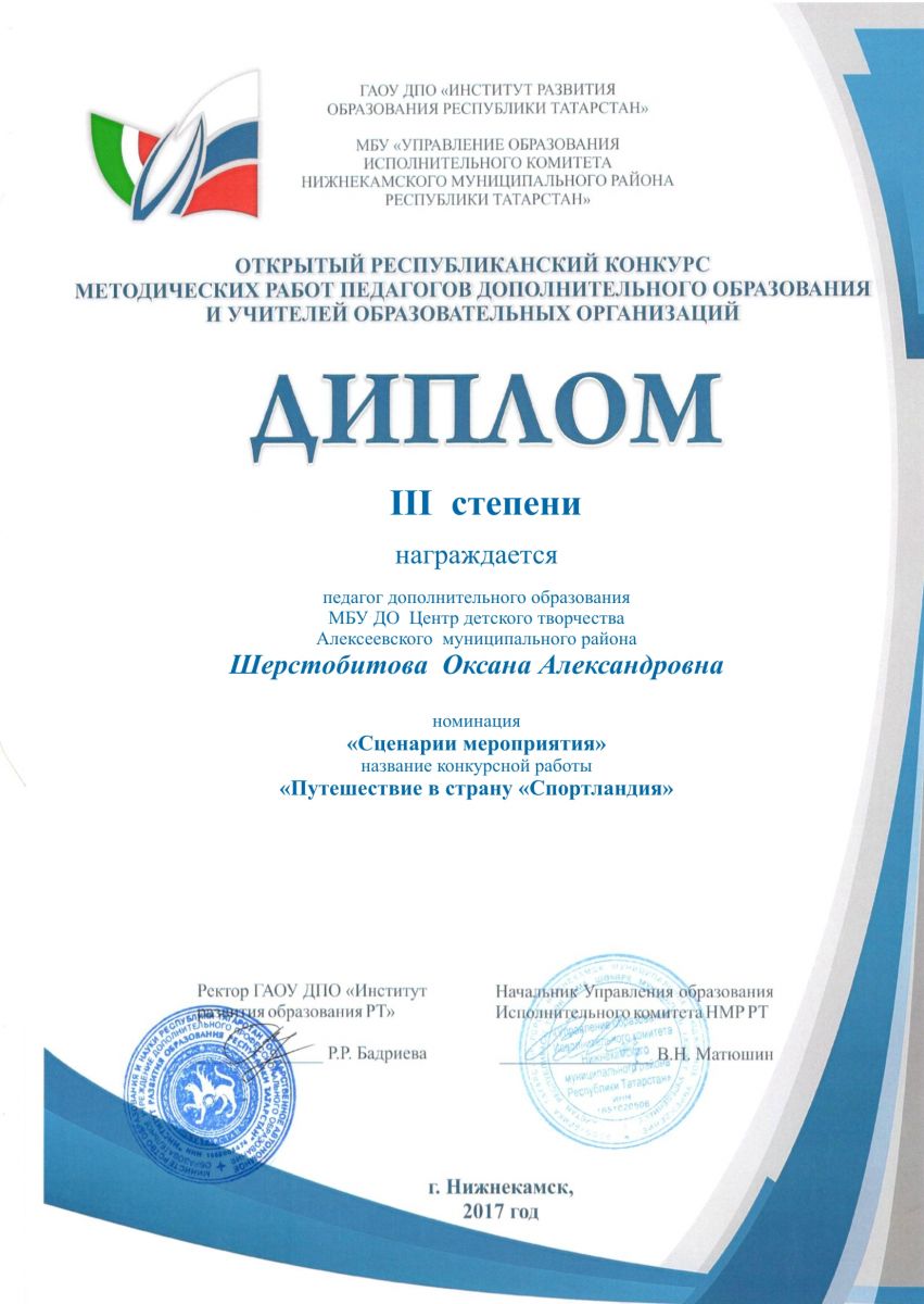 Открытый республиканский конкурс методических работ педагогов дополнительного образования и учителей образовательных организаций, номинация "Сценарии мероприятия", Шерстобитова О.А., Диплом III степени, март 2017 г.