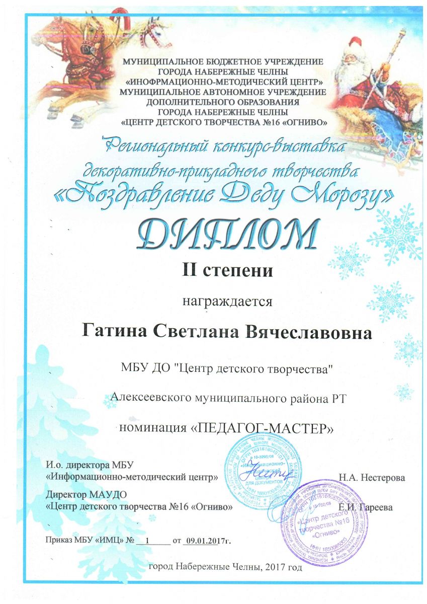 Региональный конкурс-выставка декоративно-прикладного творчества "Поздравление Деду Морозу", номинация "Педагог-мастер", Гатина С.В., Диплом II степени, январь 2017 г.