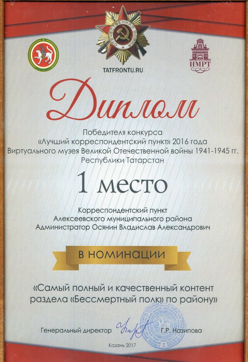 Конкурс "Лучший корреспонденсткий пункт" 2016 года Виртуального музея "Великой Отечественной войны 1941-1945 г.г. Республики Татарстан, номинация "Самый полный и качественный контент раздела "Бессмертный полк" по району", Осянин В.А., 1 место, январь 2017 г.