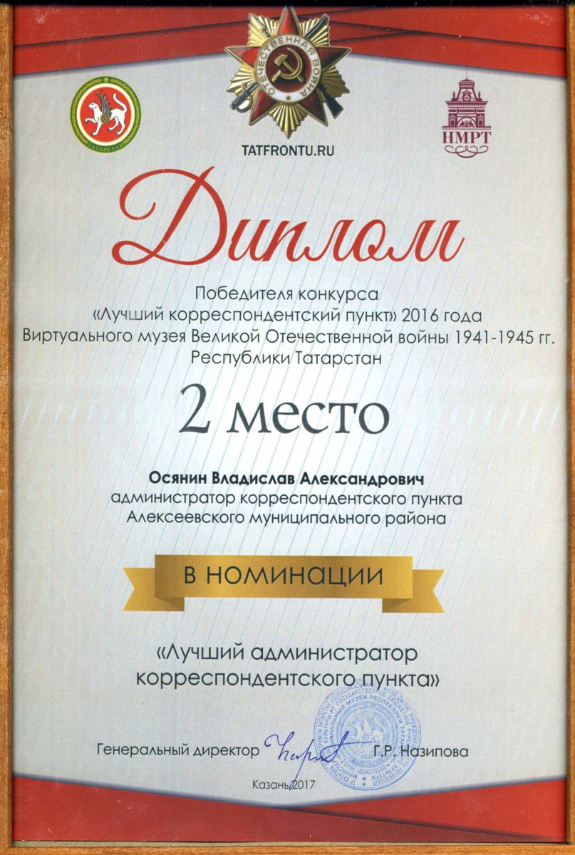 Конкурс "Лучший корреспонденсткий пункт" 2016 года Виртуального музея Великой Отечественной войны 1941-1945 г.г. Республики Татарстан, номинация "Лучший администратор корреспонденсткого пункта", Осянин В.А., 2 место, январь 2017 г.