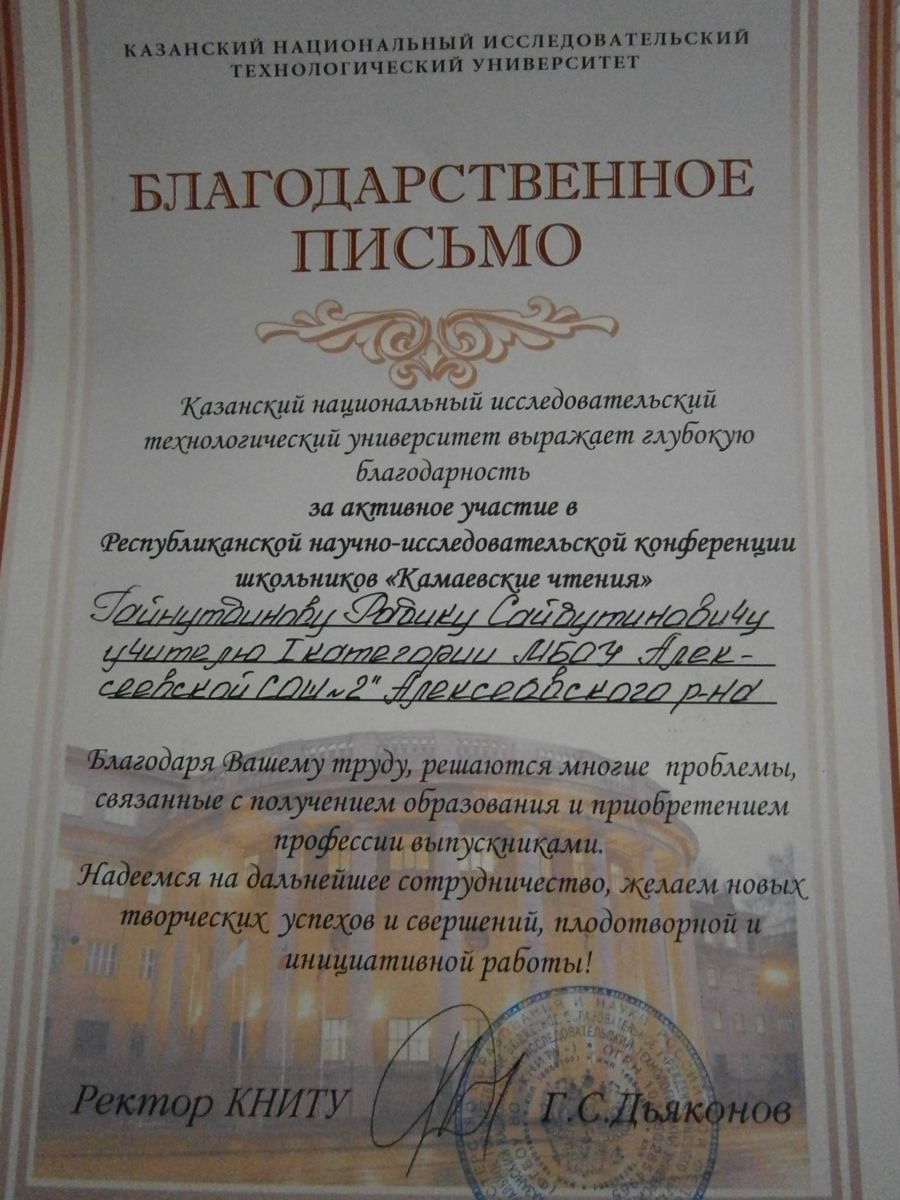Республиканская научно-исследовательская конференция школьников "Камаевские чтения", Гайнутдинов Р.С., Благодарственное письмо, апрель 2017 г.