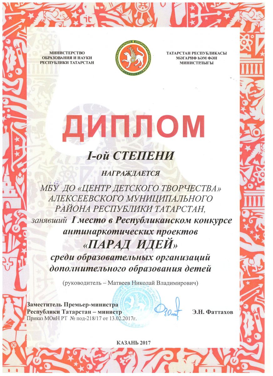 Республиканский конкурс антинаркотических проектов "Парад идей" среди образовательных организаций дополнитьельного образования детей, Матвеев Н.В., Диплом I степени, февраль 2017 г.