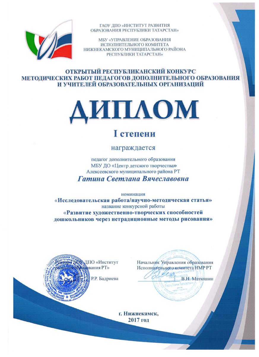 Открытый республиканский конкурс_методических работ педагогов дополнительного образования и учителей образовательных организаций, Гатина С.В., Диплом I степени, март 2017 г.