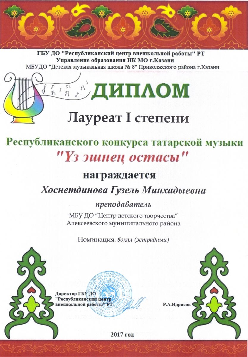 Республиканский кокнурс татарсской музыки "Yз эшнен остасы", Хоснетдинова Г.М. , Лауреат I степени, май 2017 г.