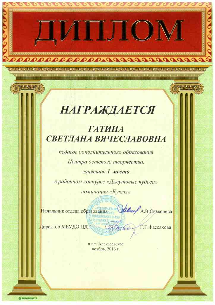 Районный конкурс "Джутовые чудеса", Гатина С.В., 1 место, ноябрь 2016 г.