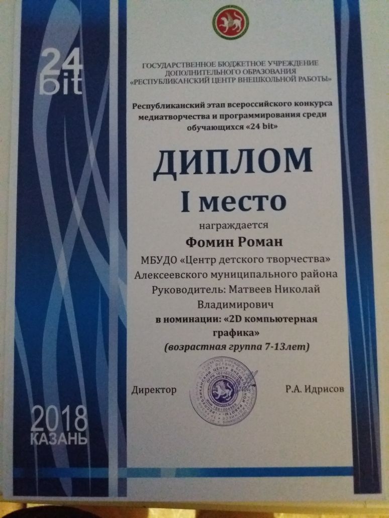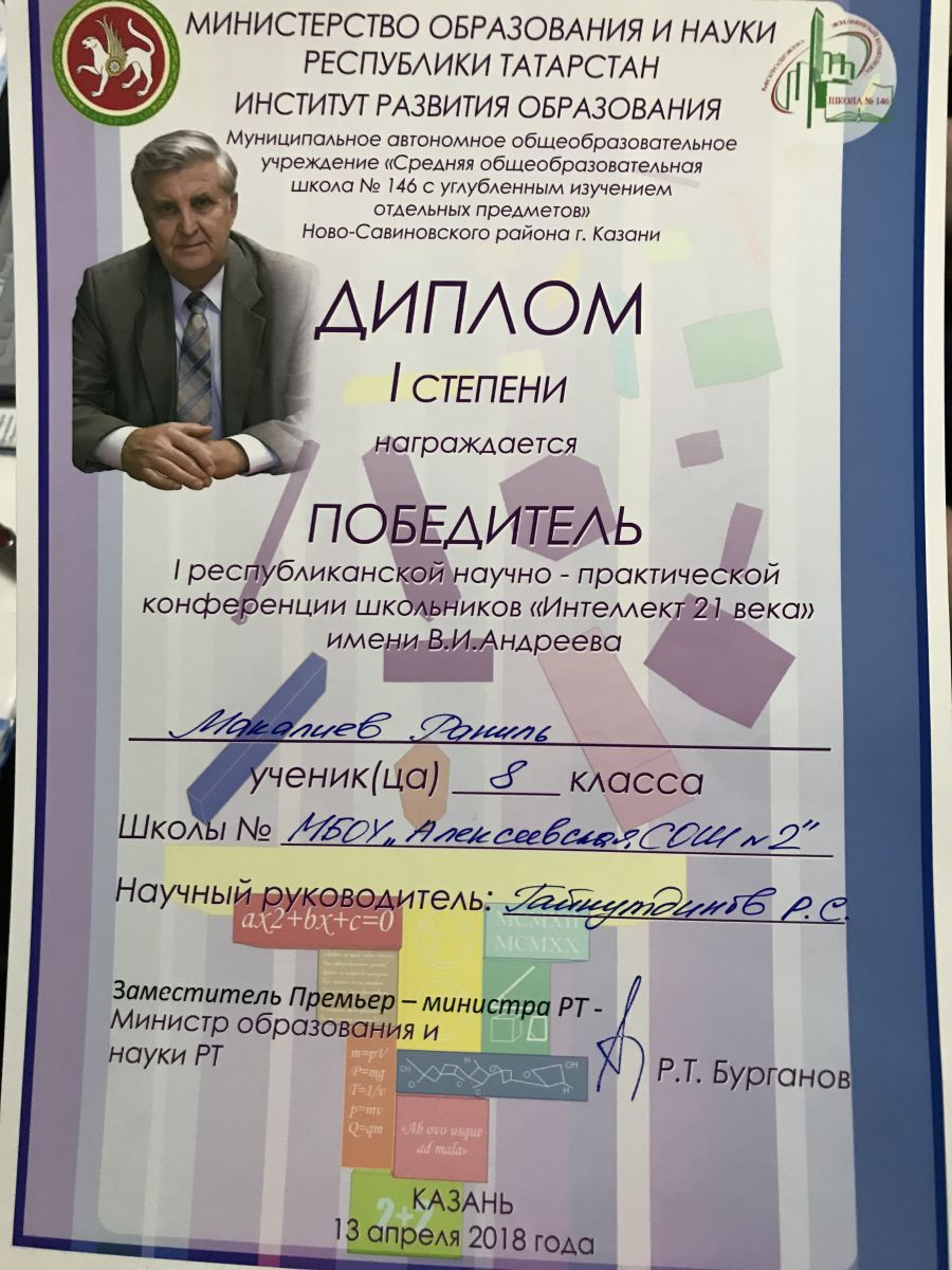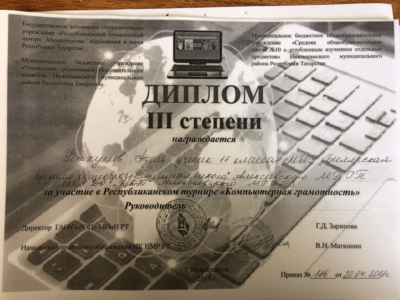 ► Республиканский турнир "Компьютерная грамотсноть", Махмутов Адель, Диплом 3 степени, апрель 2018