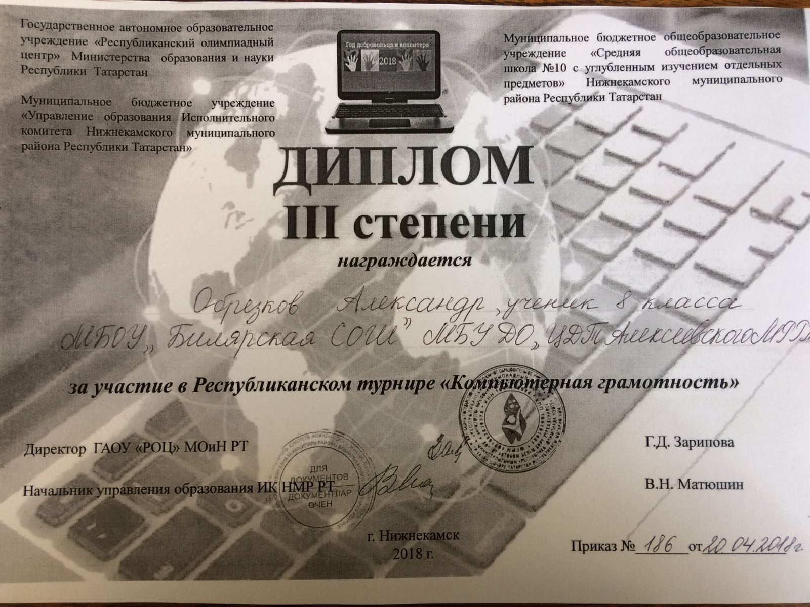 ► Республиканский турнир "Компьютерная грамотность", Обрезков Саша, Диплом 3 степени, апрель 2018