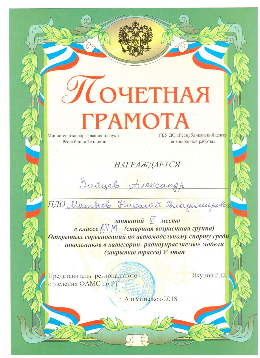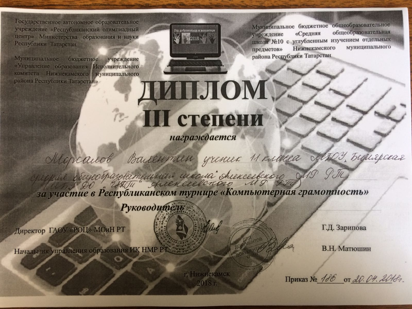 ► Республиканский турнинр "Компьюерная грамотность, Морсалов Валентин, Диплом 3 степени, апрель 2018