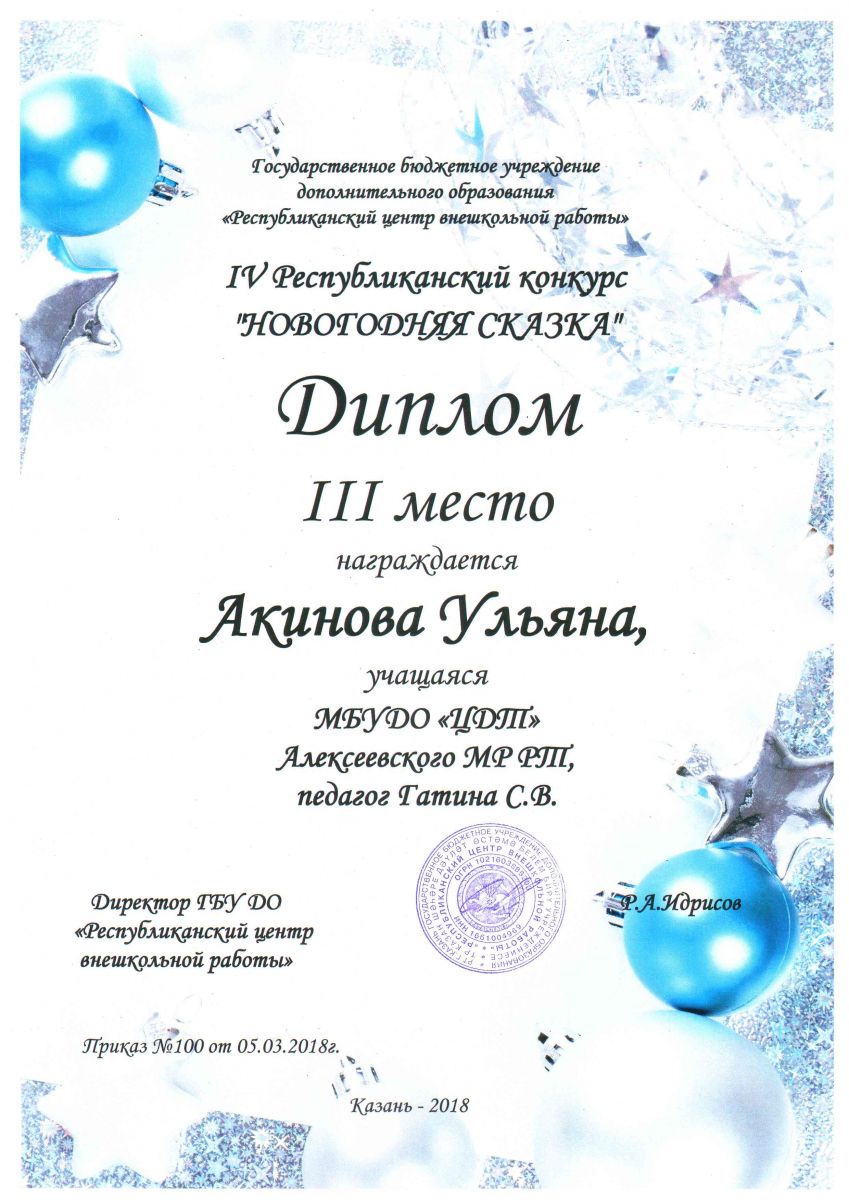 ► IV Республиканский конкурс "Новогодняя сказка", Акинова Ульяна, 3 место, март 2018