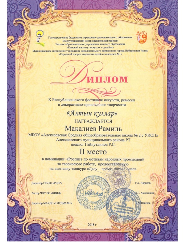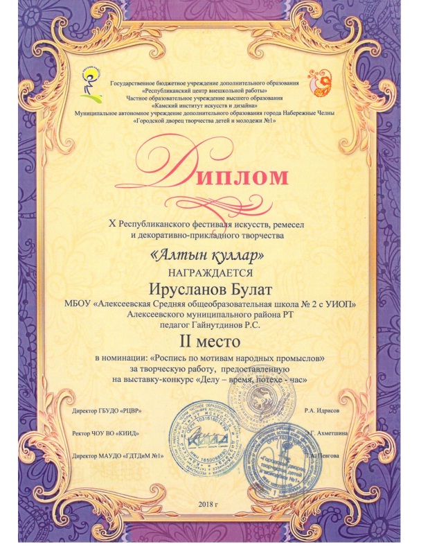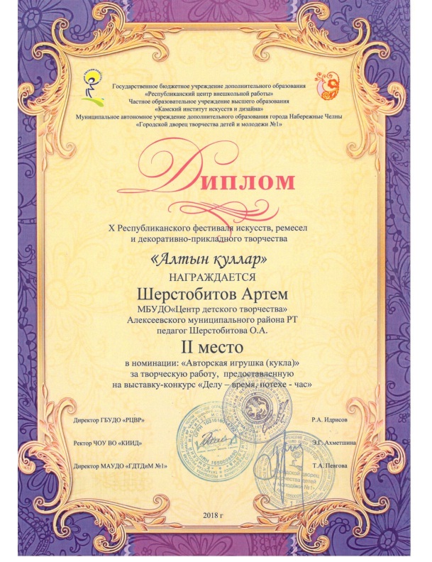 ► X Республиканский фестиваль искусств, ремесел и декоративно-прикладного творчества "Алтын куллар" , март 2018 - ♦ Шерстобитов Артем, 2 место