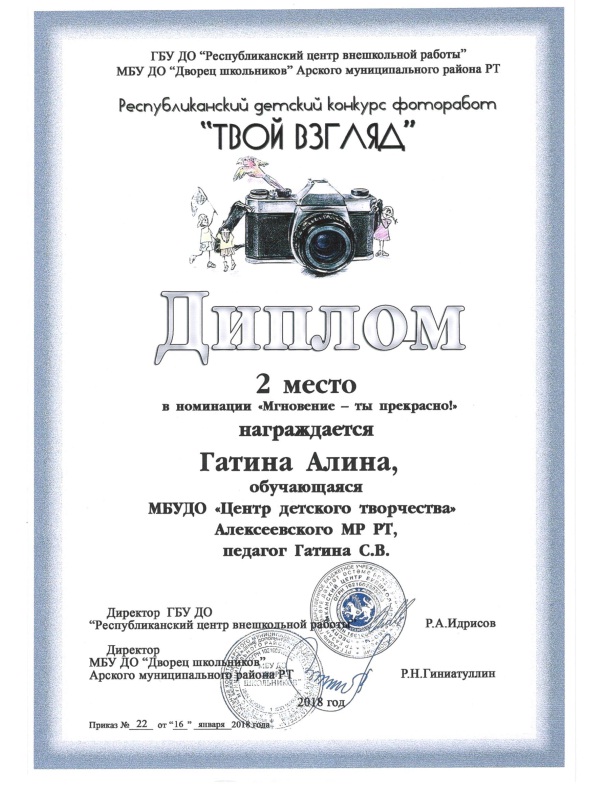 ► Республиканский детский конкурс фоторабот "Твой взгляд", Гатина Алина, 2 место, январь 2018
