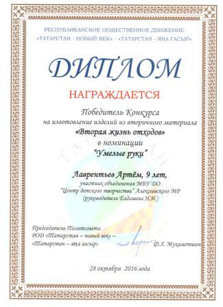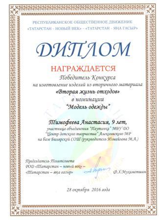 Учащиеся Алексеевского муниципального района принимали участие в республиканском конкурсе из вторичного материала «Вторая жизнь отходов» 28 октября 2016 года в Доме Дружбы народов Татарстана во время заседания международной научно-практической конференции «Хартия Земли – практический инструмент решения фундаментальных проблем устойчивого развития» состоялось награждение победителей республиканского конкурса на изготовление изделий из вторичного материала «Вторая жизнь отходов». Дипломы и призы победителям, а именно: Тимофеевой Анастасии, учащейся объединения "Паутинка" (руководитель Измайлова М.А.) - номинация "Модель одежды" (предмет одежды или аксессуар) – за "Пляжный рюкзачок"), Лаврентьеву Артему, учащемуся объединения "Ручное творчество" (руководитель Елдашева Н.И.) - номинация "Умелые руки" (конструкции, устройства и др. для применения в быту) – за "Вешалку для одежды") вручили заместитель Председателя Государственного Совета РТ Римма Атласовна Ратникова и председатель Исполкома Политсовета Движения «ТНВ» Алсу Абдрахмановна Тарханова.