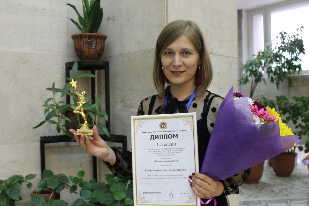 Опубликовано: 15.05.201913-14 мая 2019 года в г.Набережные Челны состоялся финал республиканского этапа Всероссийского конкурса профессионального мастерства педагогических работников «Воспитать человека», в котором приняла участие Сайфутдинова Айгуль Хамитовна, педагог-организатор МБОУ «Алексеевская начальная школа №4» - победитель муниципального и зонального этапов данного конкурса.
