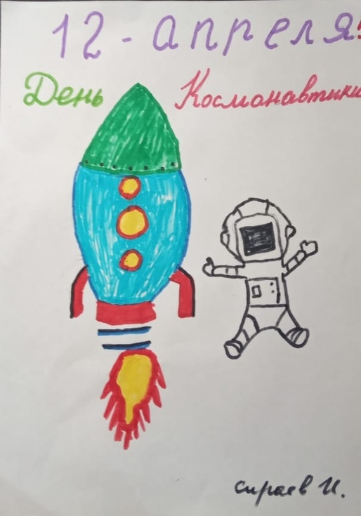 Опубликовано: 11.04.2020Обучающийся объединения «Мир красок» Ислам С. нарисовал рисунок к празднику и поздравляет всех жителей поселка Алексеевское с Днем Космонавтики.