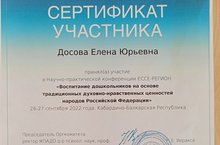 26 сентября 2022 г. воспитатель дошкольной группы Досова Е.Ю.приняла участие в вебинаре НПК ЕССЕ –РЕГИОН на тему «Воспитание дошкольников на основе традиционных духовно – нравственных ценностей народов Российской Федерации».
