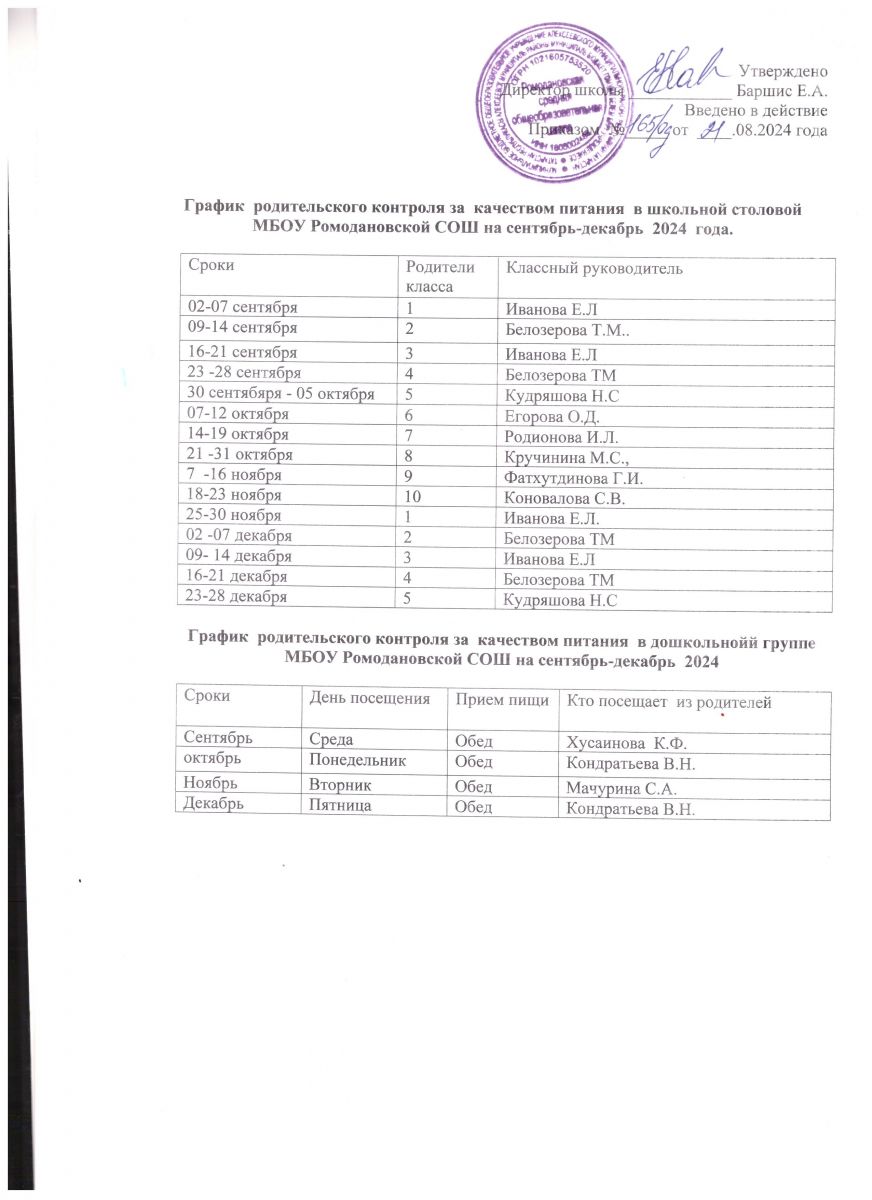 График родительского контроля за качеством питания в школьной столовой и дошкольной группе  сентябрь-декабрь 2024 г.