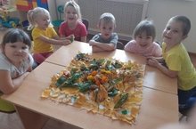 Сегодня ребята дошкольной группы сделали красивый осенний ковер из листьев, яблок, шиповника, еловых иголок и шишок, которые сами собрали на прогулке.