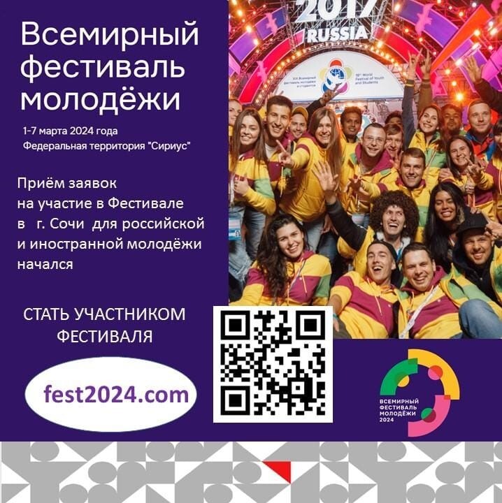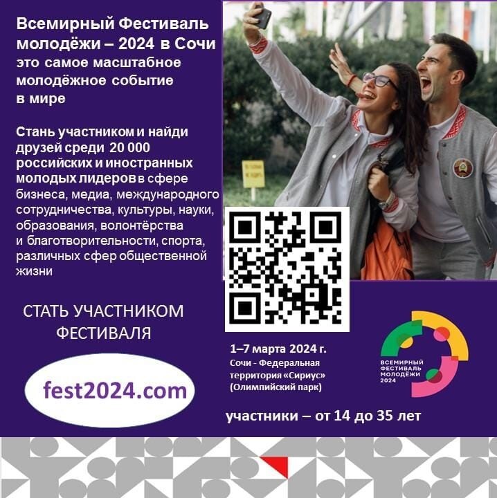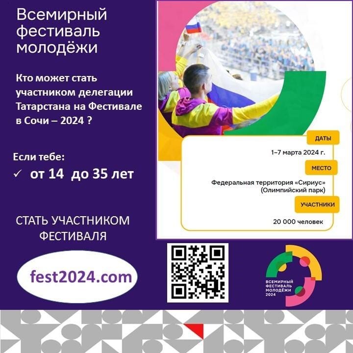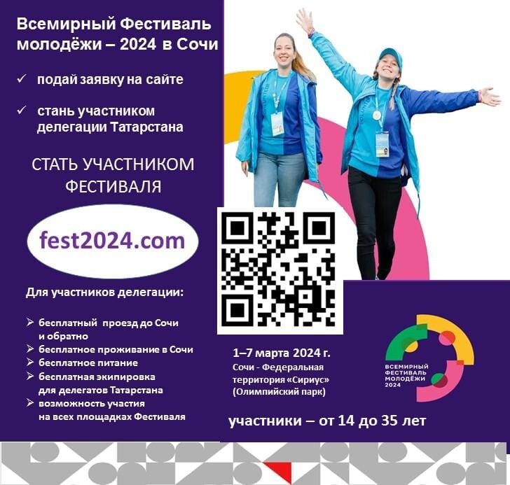 В марте 2024 года в соответствии с Указом Президента Российской Федерации В.В.Путина от 05.04.2023 № 249 в г.Сочи, на территории Олимпийского парка, состоится Всемирный фестиваль молодежи. Участниками Фестиваля станут более 20 тысяч представителей молодежи зарубежных стран и России (в возрасте от 14 до 35 лет), в том числе – 250 делегатов и 120 волонтеров молодежи Татарстана.