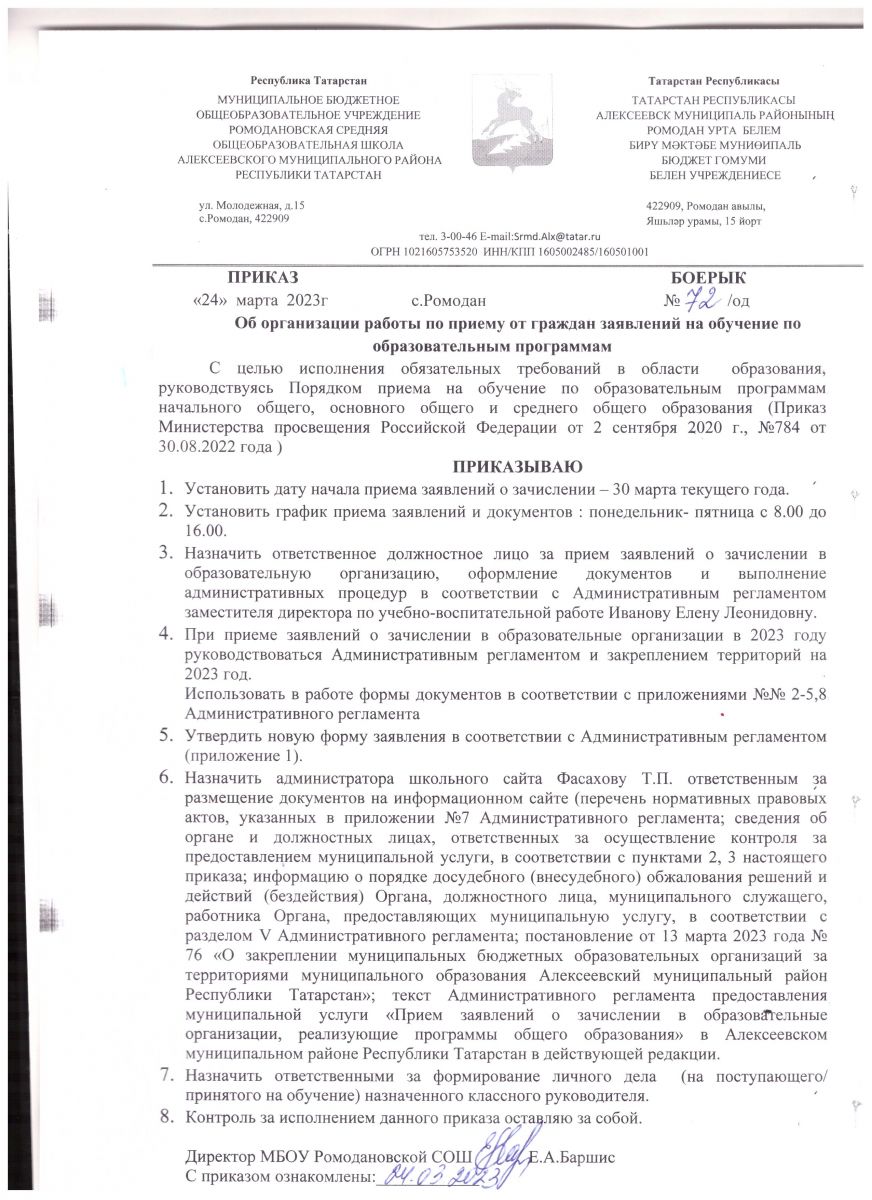 Приказ №72 от 24.03.2023 года "Об организации работы по приему от граждан заявлений на обучение по образовательным программам"