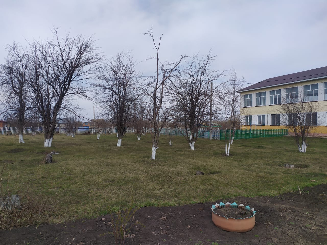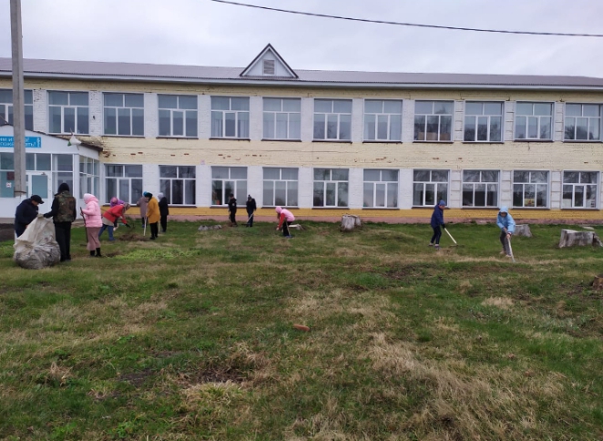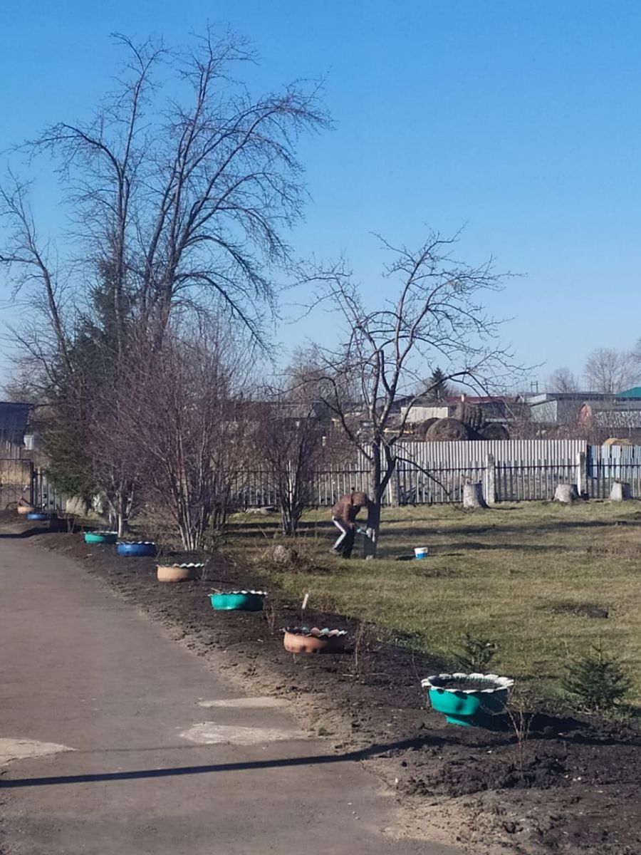 Сегодня был организован очередной субботник по уборке территории. Участники субботника убрали мусор, спилили сухие деревья и кустарники, побелили стволы деревьев в саду школы.
