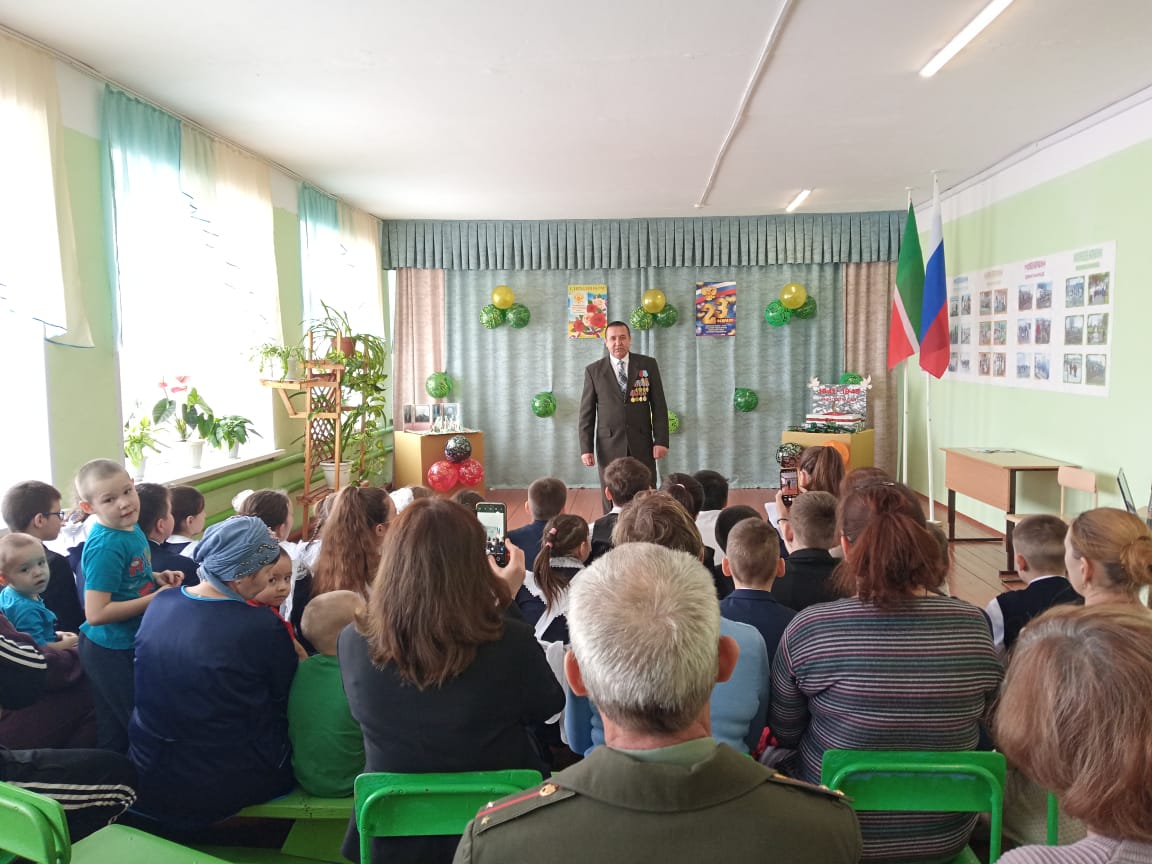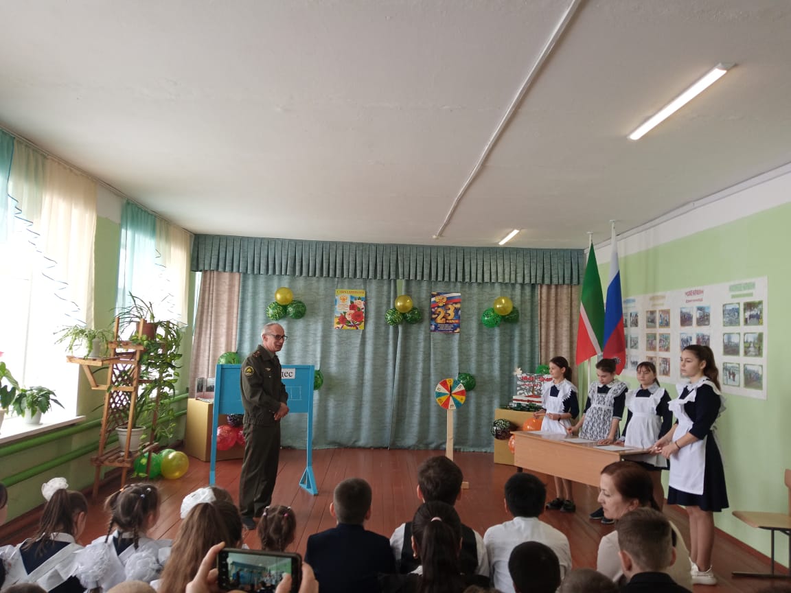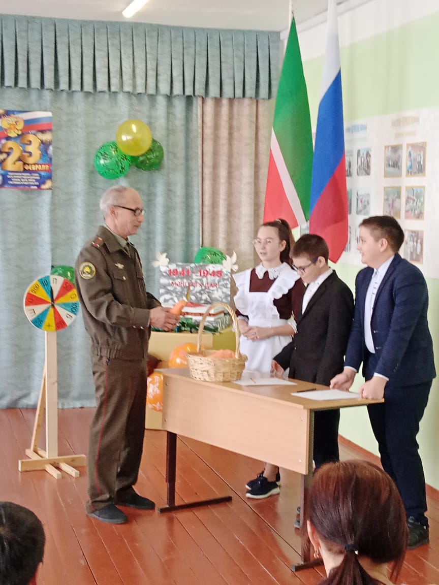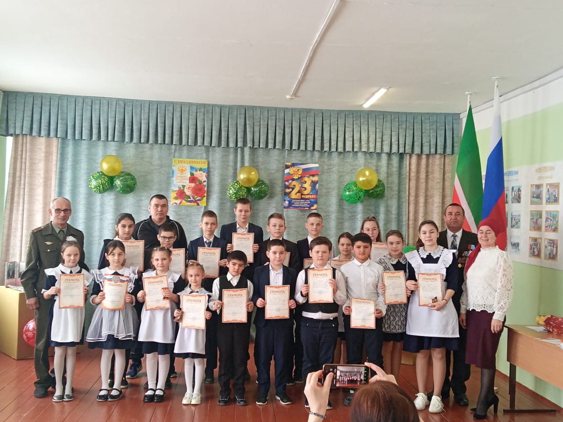 Сегодня совместно с СДК было организовано праздничное мероприятие, посвященное ко Дню Защитника Отечества.На праздник был приглашен наш односельчанин Хаматгалеев Фанис Фоатович, который в мирное для нашей страны время выполнил свой интернациональный долг в Авганистане.Учащиеся школы поздравили мужчин с праздником, представили свои интересные концертные номера.Идрисов Ф.Ф.,учитель физической культуры, всех учеников наградил грамотами ,сдавших нормативы ВФСК "ГТО". Учитель ОБЖ ,руководитель военно-патриотического клуба Мазидуллин А.А. провел интеллектуальную игру "Поле чудес" среди учащихся 5-7 классов. Дети играли с увлечением, мероприятие получилось интересное, познавательное.
