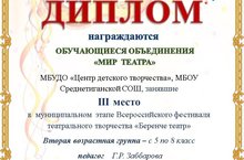 Дипломом за 3 место награждены обучающиеся объединения "Мир театра" в муниципальном этапе Всероссийского фестиваля театрального творчества "Беренче театр". Молодцы! Желаем дальнейших успехов!