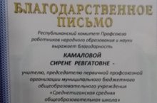 Камалова С.Р. - председатель первичной профсоюзной организации МБОУ Среднетиганская СОШ награждена Благодарственным письмом за активную работу в Профсоюзе.