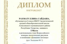 Учащийся 4 класса Среднетиганской СОШ Рахматуллин Сайдаш принял участие в региональном этапе Всероссийского конкурса экологических рисунков. В номинации "Домашние питомцы" занял 1 место. Руководитель: Халилова Ф.Г.