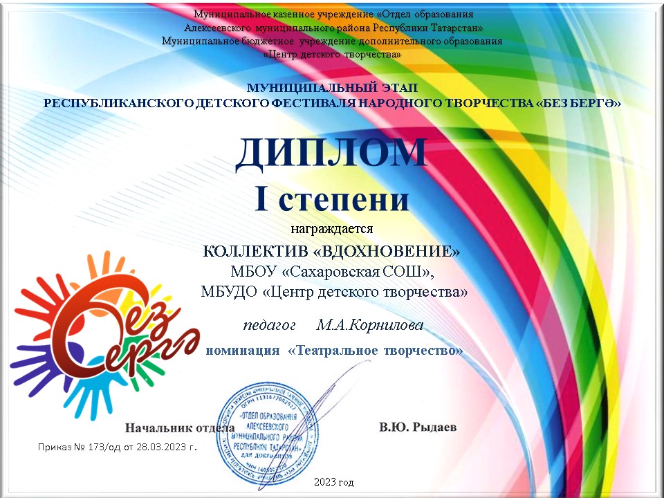 С 10 февраля по 12 марта 2023 года состоялся муниципальный тур Республиканского детского фестиваля народного творчества "Без бергэ". Зверев Дмитрий(9 класс), Мезенцева Полина(8 класс)учащиеся МБОУ"Сахаровская ООШ", воспитанники Центра детского творчества объединения "Вдохновение" получили диплом I степени в номинаци "Театральное творчество". Руководитель: Корнилова М.А., учитель иностранного языка МБОУ "Сахаровская ООШ", педагог дополнительного образования МБУДО"Центр детского творчества". Молодцы! Дальнейших вам успехов!