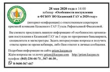 В четверг, 28 мая 2020 года, в 14:00 по московскому времени состоится вебинар (интернет-конференция) с ответственным секретарем приемной комиссии Казанского ГАУ (ссылка размещена на официальном сайте Приёмной комиссии Казанского ГАУ priem.kazgau.ru).