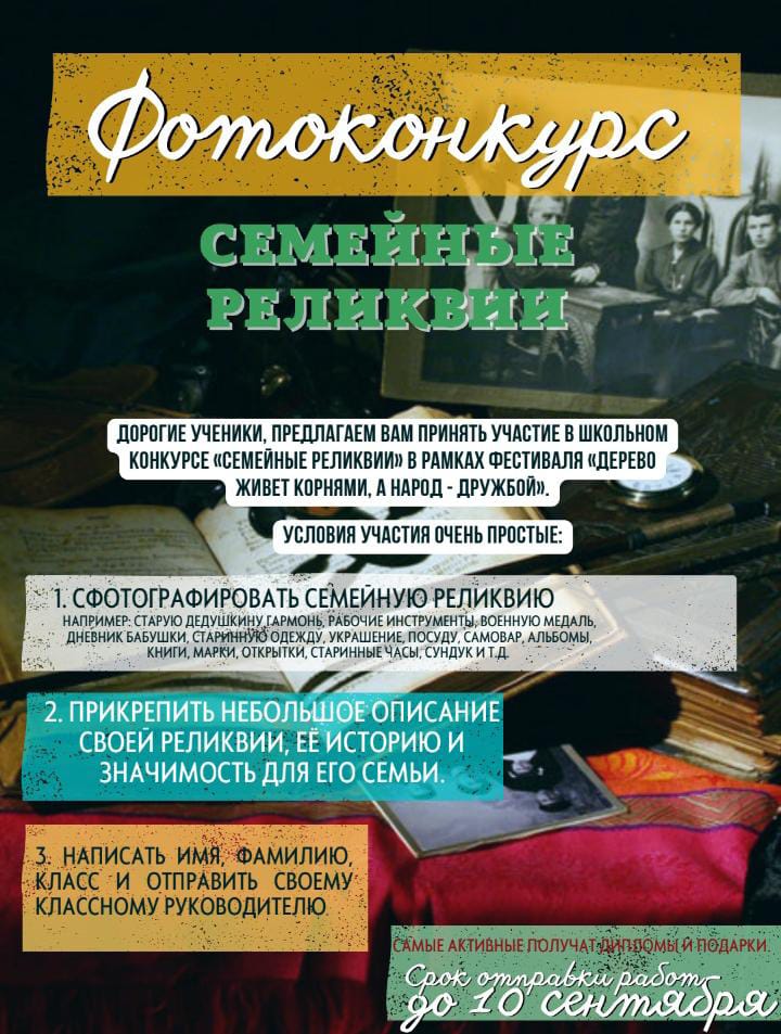 Реализация данного проекта предполагает проведение школьного конкурса "Семейные реликвии". Работы принимаются до 10 сентября. С правилами участия можно ознакомиться в афише, представленной здесь.
