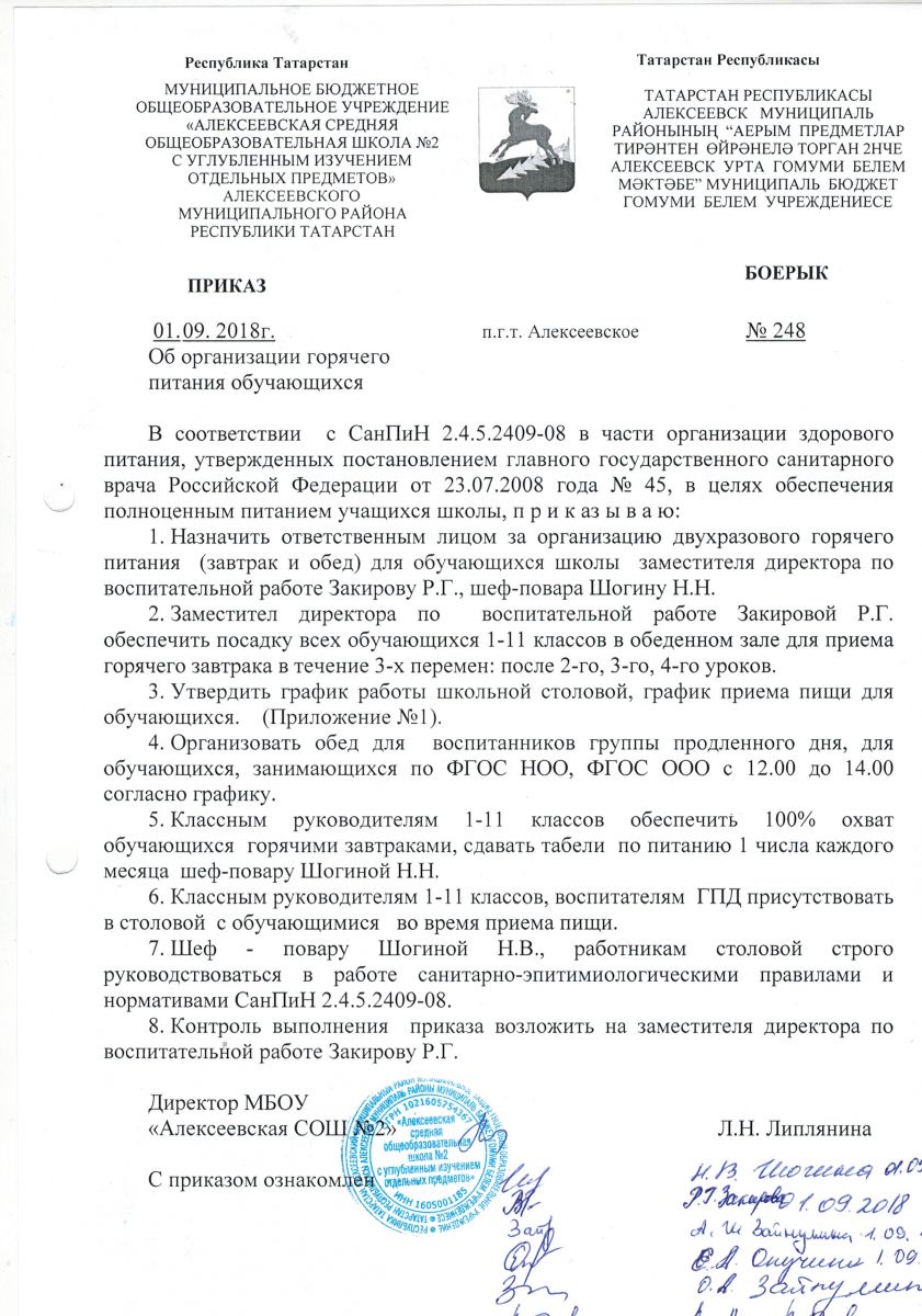 Приказ №248 от 01.09.2018 Об организации горячего питания обучающихся