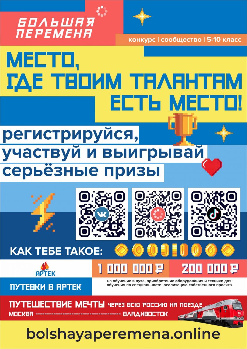 - Победители среди учеников 5-7 классов выиграют «путешествие мечты» на поезде «Большая перемена» от Москвы до Владивостока и обратно.