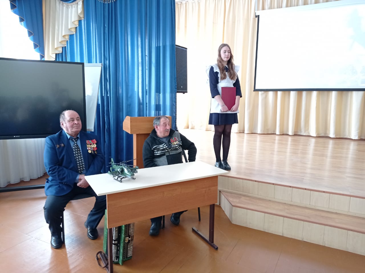 Опубликовано: 15.02.2023Ветераны Афганистана Владимир Семочкин, Рафкат Медведев, Валерий Игнатичев и участник Карибского кризиса Анатолий Лоскутов, стали почетными гостями школы. Воины интернационалисты рассказали ребятам о своей службе. Владимир Семочкин, бывший вертолетчик, объяснил ребятам как летает МИ-24 или «Крокодил» - так называли вертолет в Афганистане, и душевно исполнил свою любимую песню. Анатолий Лоскутов поделился историей службы на Кубе. Завершилась встреча минутой молчания в память о солдатах погибших при выполнении интернационального долга.