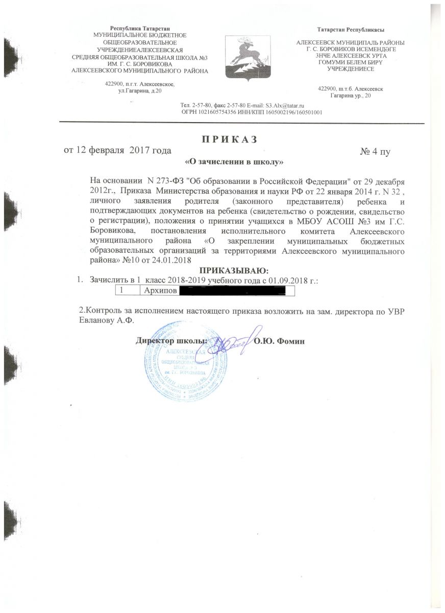 Приказ №4 от 12.02.2018 о приеме в 1 класс