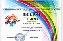Фаттахова Малика, ученица 2 В класса награждена дипломом 1 степени муниципального этапа Республиканского конкурса выставки-ярмарки декоративно-прикладных изделий "СУВЕНИРЫ РОССИИ" в рамках республиканского детского фестиваля народного творчества " БЕЗ БЕРГЭ". Руководитель: Мигушина Вера Ефимовна. Поздравляем!!!