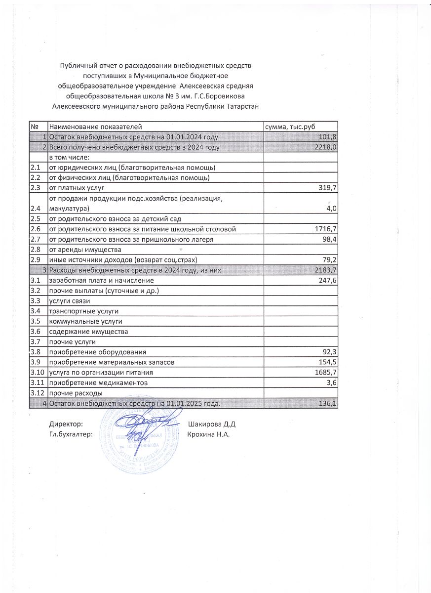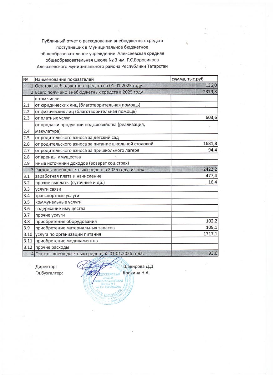 Публичный отчет расходования внебюджетных средств поступивших МБОУ АСОШ №3 им.Г.С.Боровикова