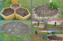 Сотрудники нашей школы благоустроили клумбы цветами. Теперь наша территория зацветет яркими красками./ Безнең мәктәп хезмәткәрләре чәчәкләр утырттылар.