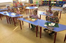 В средней группе прошло занятие по аппликации на тему: «Тюбетейка», где дети познакомились с татарскими национальными костюмами и орнаментом, научились украшать и наклеивать национальные узоры на тюбетейку. Детям на занятии очень понравилось!/ Урта төркемдә «Түбәтәй»темасына аппликация дәресе узды. Анда балалар татар милли киемнәре һәм орнаментлары белән таныштылар, түбәтәй өстенә милли бизәкләрне бизәргә һәм ябыштырырга өйрәнделәр. Балаларга дәрестә бик ошады!