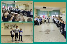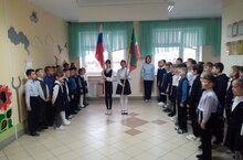 По традиции в понедельник наши школьники внесли государственные флаги под исполнения государственного гимна./ Дүшәмбе традиция буенча безнең мәктәп укучылары дәүләт гимны башкардылар һәм дәүләт флагларын керттеләр.