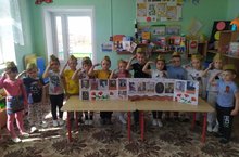 В старшей группе юные патриоты Отчизны почтили память своих дедов и прадедов ,создали стенд боевой славы с фотографиями героев своей семьи выставку рисунков на День Победы./Өлкән төркемдә Ватаныбызның яшь патриотлары үзләренең бабаларын искә алдылар, үз гаиләләре геройларының фотосурәтләре белән хәрби дан стенды һәм Җиңү көненә рәсемнәр күргәзмәсе оештырдылар.