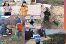 Дети подготовительной группы с родителями приображают уборку территории вокруг дома. Вот уже и последние сухие листья собрали. А после дождя, на убранной территории, начала пробиваться зелёная травка./Әзерлек төркеме балалары әти-әниләре белән йорт тирәсендәге территорияләрен җыештыралар.